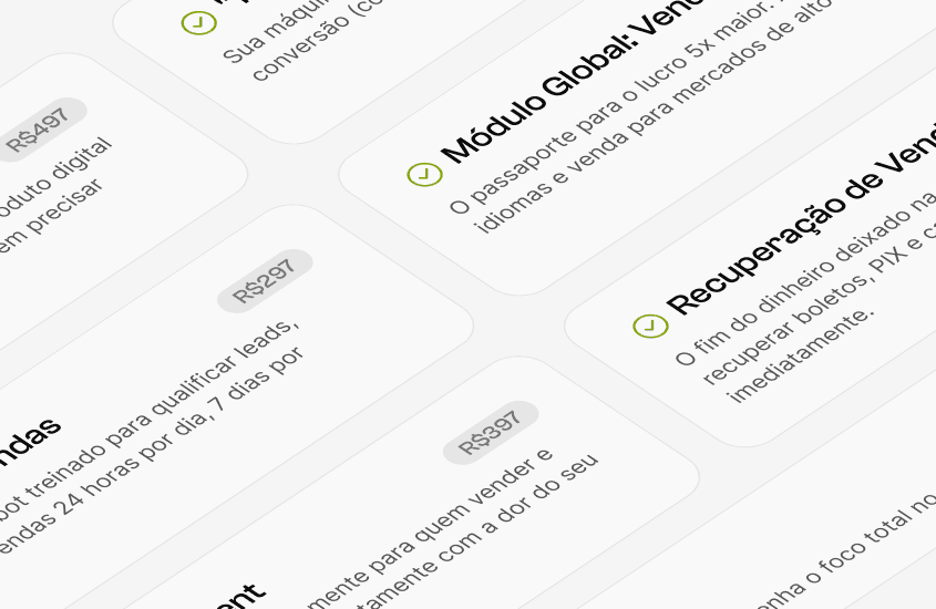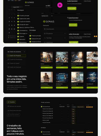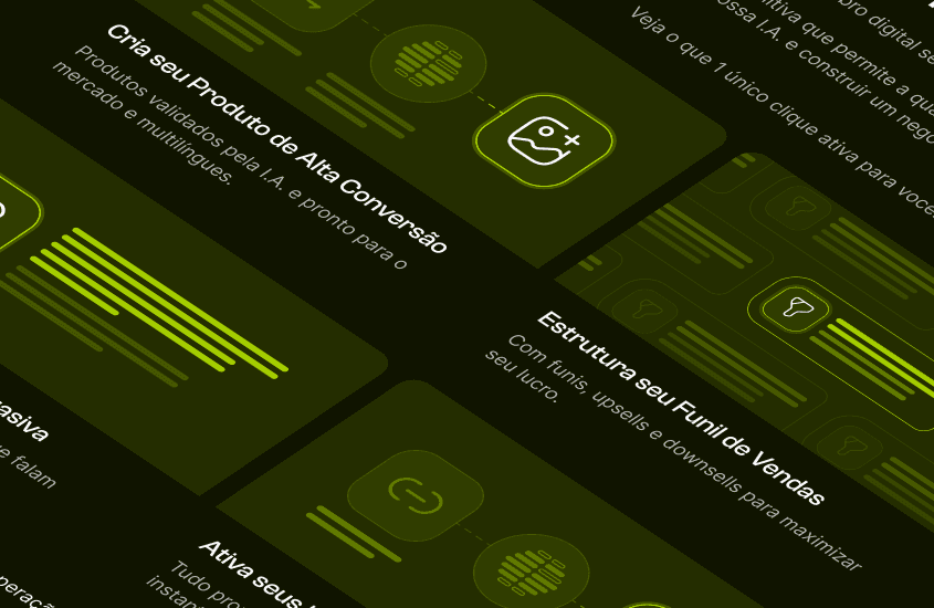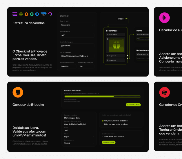 A plataforma permite que o usuário crie produtos digitais, funis, ofertas, estratégias e ativos de marketing a partir de poucos cliques, tudo guiado por automações inteligentes dentro do próprio sistema.
